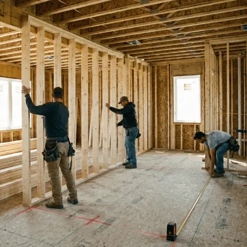 Interior framing, doors, trim work, drywall, and flooring preparation.
